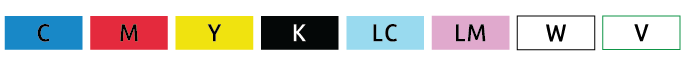 ⟩ Налични са следните цветове: Cyan (циян), Magenta (магента), Yellow (жълто), Black (`черно), Light Cyan (светъл циан), Light Magenta ( светла магента), White (бяло) и Varnish (прозрачен лак)