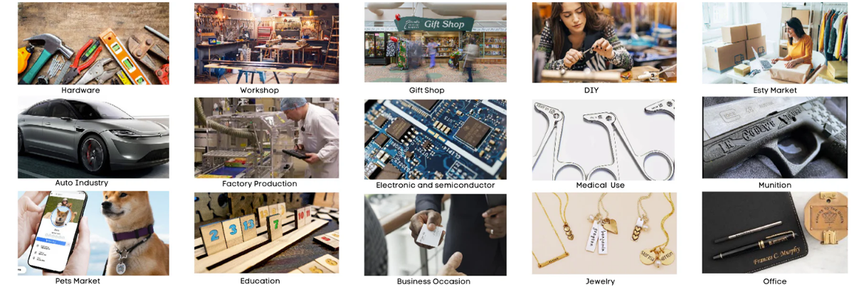 Може да гравира числа, дати, различни видове баркодове и лога върху голямо разнообразие от материали. Те включват всички метали, каучук и гума, кожа, някои пластмаси, материали за галванопластика и епоксидна смола. Нашата компактна FIBER машина 20W е сред най-достъпните лазерни гравьори на пазара. Създават се трайни маркировки без нужда от консумативи с преносим дизайн и лесна за работа система, която увеличава Вашата производителност.