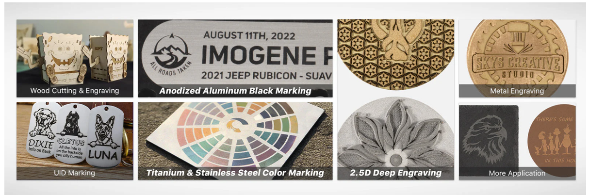 Подходящи са за гравиране на материали като дърво, кожа, пластмаси, текстил, MDF, картон, хартия, кориан, пено картон, фибростъкло, гума, нетъкан текстил, стъкло, алуминий, неръждаема стомана и други. Трябва да имате предвид, че CO2 лазерите гравират само метали с покритие, когато са анодизирани или оцветени. Възможно е да ползвате спрей за лазерно маркиране Cermark, за да постигнете черен цвят на гравиране. За анодирания алуминий може да се ползва Aluoxid за черно оцветяване. Без допълнителна обработка алуминият става бял след гравиране.